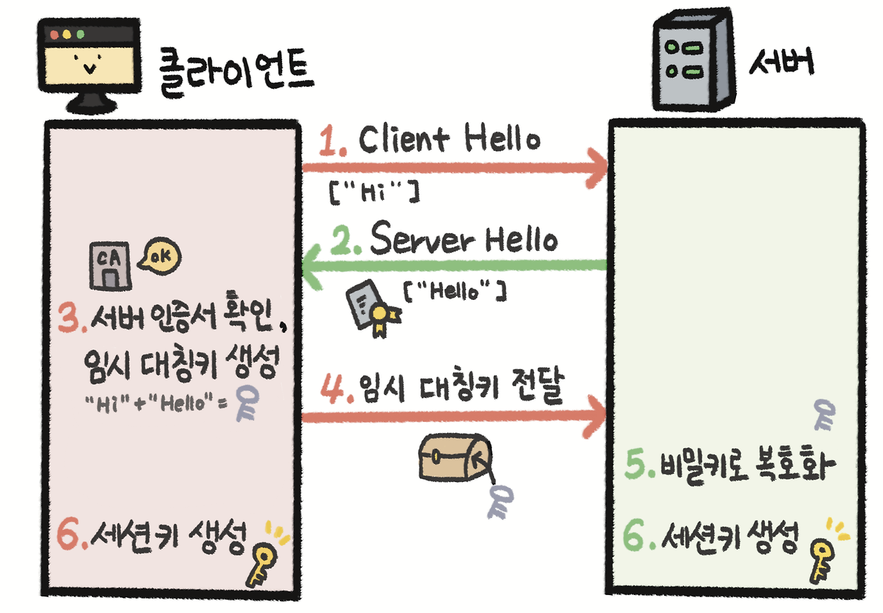 - 클라이언트와 서버간 데이터를 암호화하기 위한 세션키를 교환하는 과정에서 공개키(비대칭키) 사용