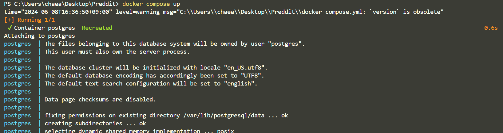 더 서치를 해보니 Docker 컨테이너가 Windows 파일 시스템에서 실행될 때 권한 문제가 발생할 수 있다고 했다. 특히 WSL2(Windows Subsystem for Linux) 환경에서는 이런 문제가 자주 발생한다고 한다. 그래서 WSL이 아닌 VSCode 터미널 PowerShell에서 docker-compose up을 해보았는데, 연결 성공