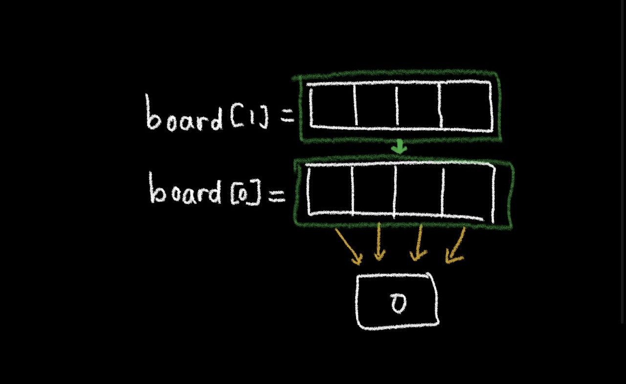 첫번째 1차원 배열이 생성되면 두번째-세번째-네번째 배열이 모두 처음 생성된 배열을 가리킨다.