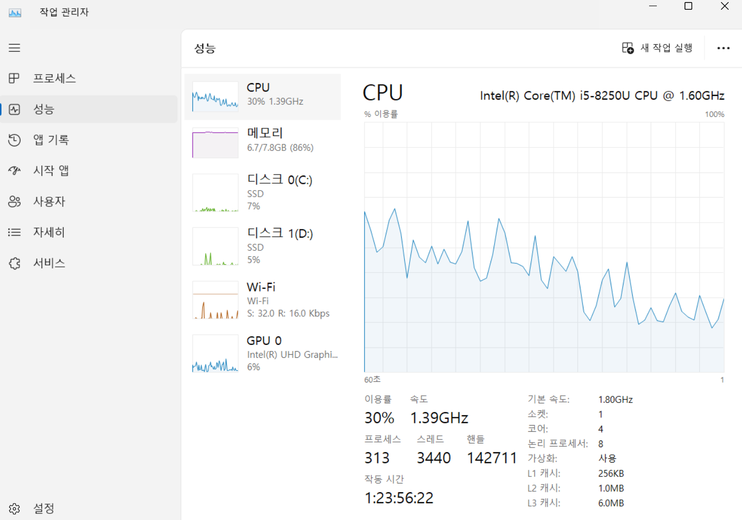 - 장치 관리자의 프로세서 : 운영체제가 운영할 수 있다고 인식된(활성화된) 총 스레드의 개수