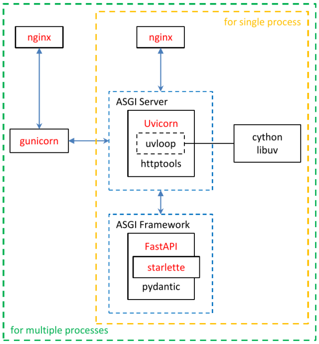 전체적인 구조 : [ASGI Framework] FastAPI - starlette - [ASGI Server] uvicorn - uvloop(cython) - libuv(cpp)