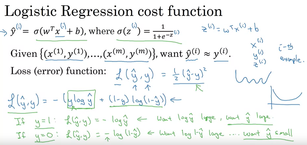 If y=1 : make L = -log^y small => make ^y large, in sigmoid ^y ≈ 1