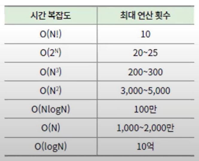 => 입력값이 100만(1,000,000 = 10^6)이라면 O(NlogN)인 알고리즘 부터 사용 가능, 2중 포문 불가